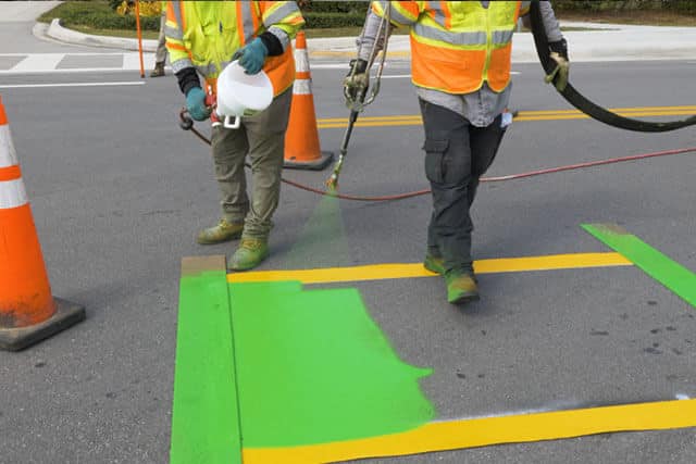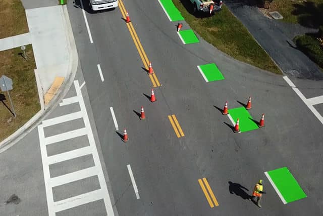 McShea Contracting successfully completed a transformative project in a residential neighborhood in Wellington, FL, installing green MMA bike lanes using a custom spray application method, which expedited the process and ensured precise and uniform coatings, complemented by thermoplastic road markings for exceptional durability and enhanced road safety.