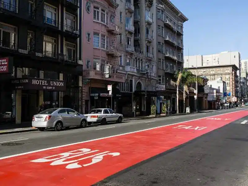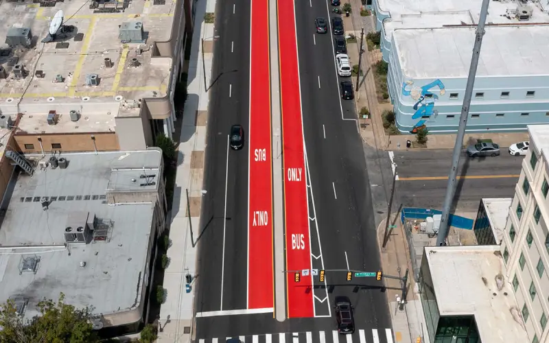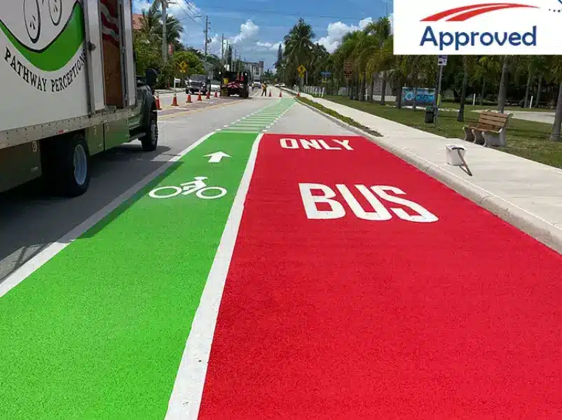 Pathway Perceptions colored lane treatment combines state-of-the-art Methyl Methacrylate resins with hardwearing aggregate and premium pigments. Our material offers excellent color stability, enhancing visibility and reducing maintenance needs for long-lasting safety. The high visibility colors increase motorist awareness, minimizing the risk of accidents. Our signature green colored bike lanes withstand heavy traffic and weather conditions, ensuring their effectiveness and longevity.