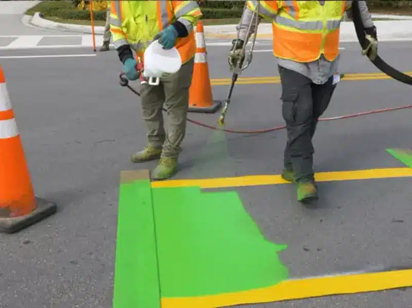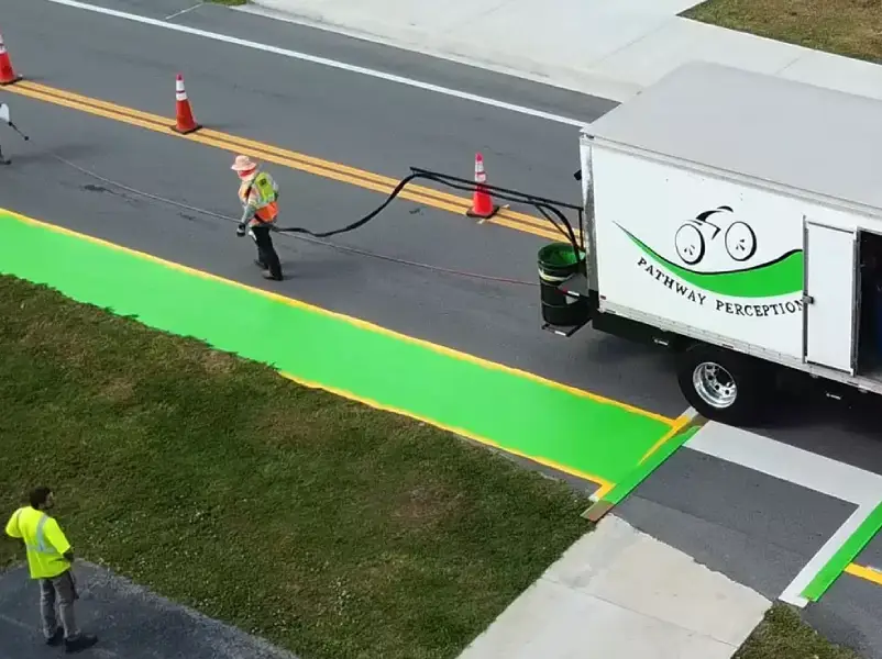 Pathway Perceptions colored lane treatment combines state-of-the-art Methyl Methacrylate resins with hardwearing aggregate and premium pigments. Our material offers excellent color stability, enhancing visibility and reducing maintenance needs for long-lasting safety. The high visibility colors increase motorist awareness, minimizing the risk of accidents. Our signature green colored bike lanes withstand heavy traffic and weather conditions, ensuring their effectiveness and longevity.