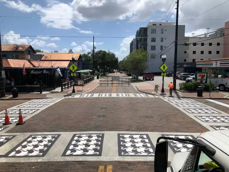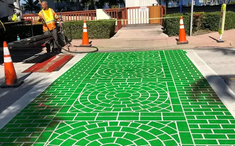 What sets us apart is our speedy installation process, requiring only 20 minutes to cure at 80°F, which means minimal disruptions to traffic flow during application. Additionally, our crosswalks boast a non-slip surface, providing cyclists and pedestrians with reliable traction, especially when navigating wet or slippery conditions. Our commitment to safety is unwavering, as we adhere to FDOT and FHWA standards, ensuring reliability and strict compliance with safety regulations. Furthermore, our crosswalks are adaptable to both concrete and asphalt surfaces, offering versatility that caters to various locations and simplifies their consistent implementation throughout a city or transportation network.